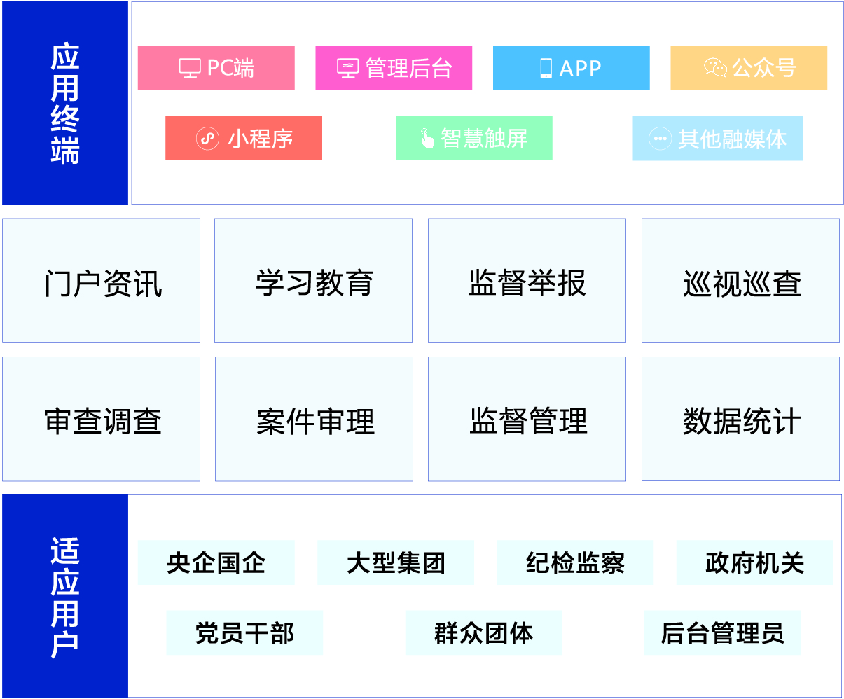 智慧纪检监察系统采用统一平台管理模式,利用 “大数据” 系统使纪检监察工作更加规范化、流程化、痕迹化,极大的提高了纪检监察干部的工作效能,为实现“互联网+纪检监察”提供了坚实基础